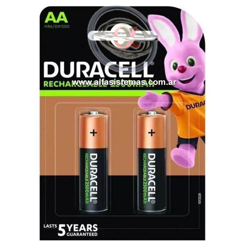 | Pilas Recargables AA Duracell 2500 Mah 1.2V x2 Unidades Características: - Marca: Duracell - Modelo: Recargable - Tamaño de la pila: AA - Unidades por pack: 2 - Voltaje nominal: 1.2V - Capacidad de la pila: 2500 mAh |